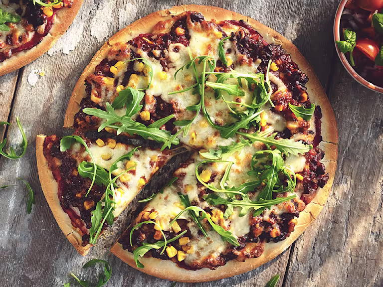 - Rull ut pizzabunnen på et ark bakepapir og legg den på et stekebrett. Dekk bunnen med pesto, ha så på Quorn-farsen, og strø over de oppkuttede tomatene sammen med revet mozzarella.