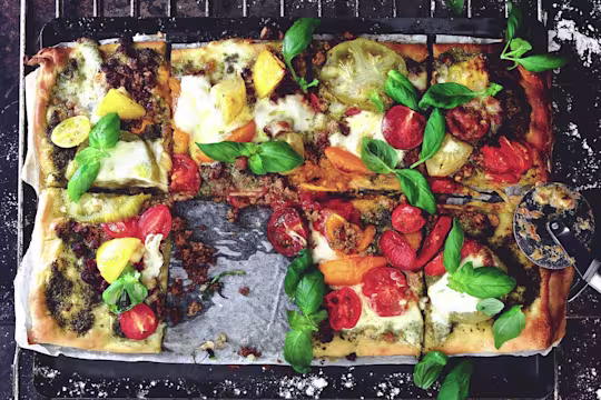 Bruk denne Pizza Caprese-oppskriften med vegetarisk Quorn-farse og lag den sammen med barna. Smør på hjemmelaget pesto og dekorer etter smak. Bon-appetit!