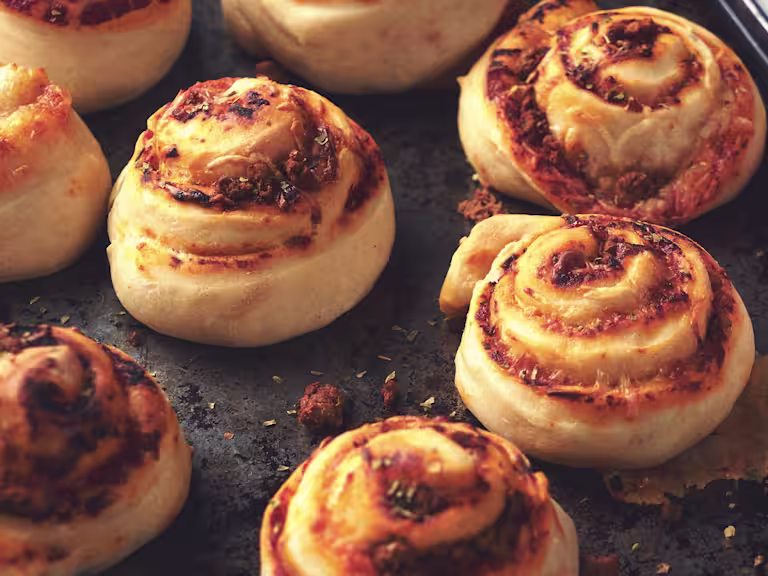 - Kjevle butterdeigen ut i et rektangel, omtrent en halv centimeter tykt, og legg farsen forsiktig langs midten av deigrektangelet. Dra den deigkanten som er lengst fra deg og brett den over farsen, slik at du lager en tubeform. Rull videre til all farsen er rullet inn i deigen og du kan dytte enden på deigen inn under rullen. Brett ytterkantene på tuben innover for å forsegle endene, og legg rullen på et lett smurt stekebrett.